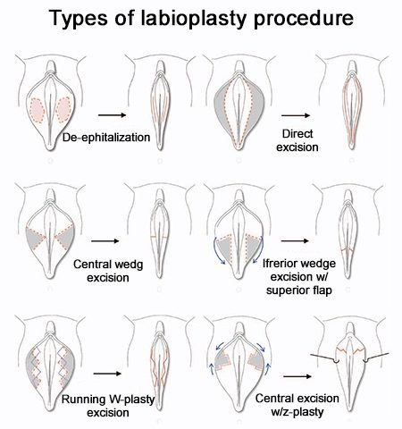 Doku yapısına ve istenilen nihai görünümüne göre küçük genital dudakların cerrahisi, labioplasti farklı yöntemler ile uygulanmaktadır: